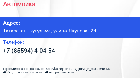 Автомойка по адресу Татарстан, Бугульма, улица Якупова, 24 в дальнейшем Организация, размещена в следующих категориях: