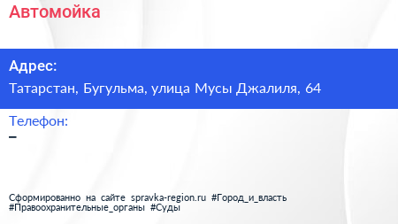Автомойка по адресу Татарстан, Бугульма, улица Мусы Джалиля, 64 в дальнейшем Организация, размещена в следующих категориях:
