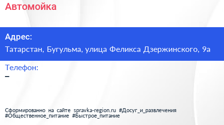 Автомойка по адресу Татарстан, Бугульма, улица Феликса Дзержинского, 9а в дальнейшем Организация, размещена в следующих категориях: