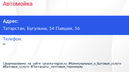 Автомойка по адресу Татарстан, Бугульма, 14 Павших, 56 в дальнейшем Организация, размещена в следующих категориях: