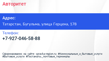 Авторитет по адресу Татарстан, Бугульма, улица Герцена, 178 в дальнейшем Организация, размещена в следующих категориях: