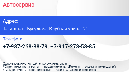 Автосервис по адресу Татарстан, Бугульма, Клубная улица, 21 в дальнейшем Организация, размещена в следующих категориях: