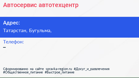 Автосервис, автотехцентр по адресу Татарстан, Бугульма, в дальнейшем Организация, размещена в следующих категориях: