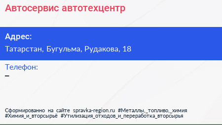 Автосервис, автотехцентр по адресу Татарстан, Бугульма, Рудакова, 18 в дальнейшем Организация, размещена в следующих категориях: