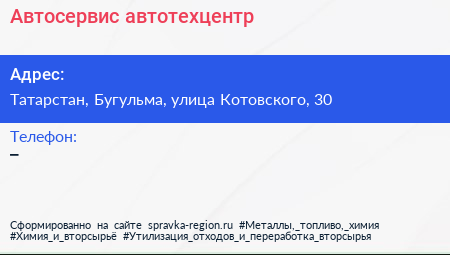 Автосервис, автотехцентр по адресу Татарстан, Бугульма, улица Котовского, 30 в дальнейшем Организация, размещена в следующих категориях: