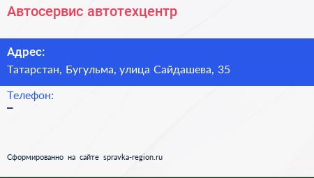 Автосервис, автотехцентр по адресу Татарстан, Бугульма, улица Сайдашева, 35 в дальнейшем Организация, размещена в следующих категориях: