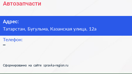 Автозапчасти по адресу Татарстан, Бугульма, Казанская улица, 12а в дальнейшем Организация, размещена в следующих категориях: