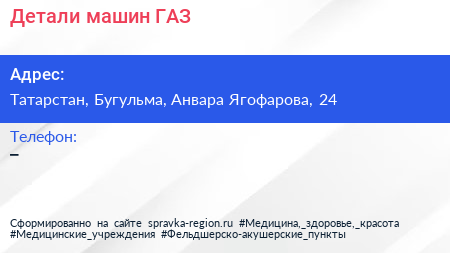 Детали машин ГАЗ по адресу Татарстан, Бугульма, Анвара Ягофарова, 24 в дальнейшем Организация, размещена в следующих категориях: