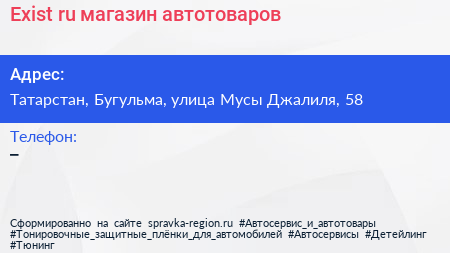 Exist.ru, магазин автотоваров по адресу Татарстан, Бугульма, улица Мусы Джалиля, 58 в дальнейшем Организация, размещена в следующих категориях: