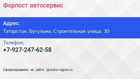 Форпост, автосервис по адресу Татарстан, Бугульма, Строительная улица, 30 в дальнейшем Организация, размещена в следующих категориях: