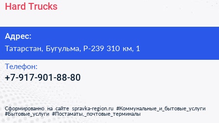 Hard Trucks по адресу Татарстан, Бугульма, Р-239 310 км, 1 в дальнейшем Организация, размещена в следующих категориях: