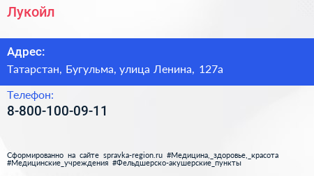 Лукойл по адресу Татарстан, Бугульма, улица Ленина, 127а в дальнейшем Организация, размещена в следующих категориях: