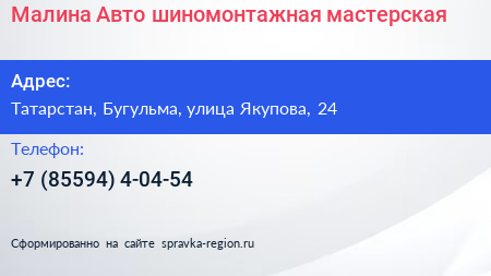 Малина-Авто, шиномонтажная мастерская по адресу Татарстан, Бугульма, улица Якупова, 24 в дальнейшем Организация, размещена в следующих категориях: