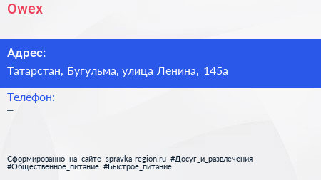Owex по адресу Татарстан, Бугульма, улица Ленина, 145а в дальнейшем Организация, размещена в следующих категориях: