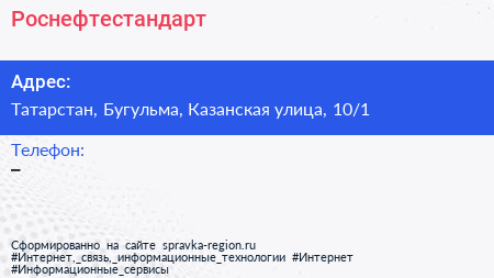 Роснефтестандарт по адресу Татарстан, Бугульма, Казанская улица, 10/1 в дальнейшем Организация, размещена в следующих категориях:
