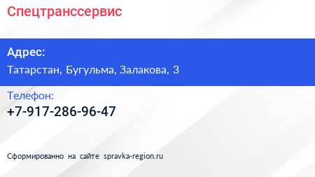 Спецтранссервис по адресу Татарстан, Бугульма, Залакова, 3 в дальнейшем Организация, размещена в следующих категориях: