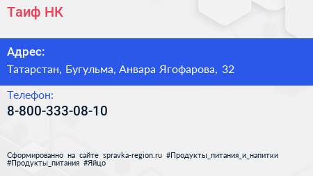 Таиф НК по адресу Татарстан, Бугульма, Анвара Ягофарова, 32 в дальнейшем Организация, размещена в следующих категориях: