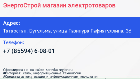 ЭнергоСтрой, магазин электротоваров по адресу Татарстан, Бугульма, улица Газинура Гафиатуллина, 36 в дальнейшем Организация, размещена в следующих категориях:
