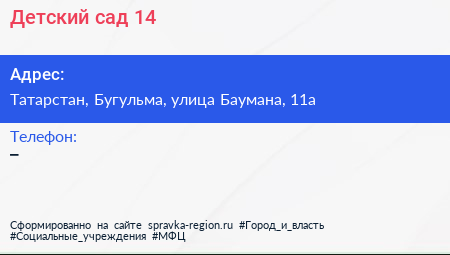 Детский сад №14 по адресу Татарстан, Бугульма, улица Баумана, 11а в дальнейшем Организация, размещена в следующих категориях: