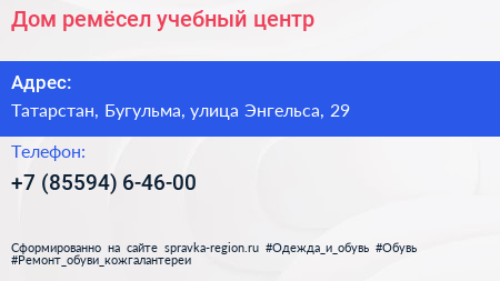Дом ремёсел, учебный центр по адресу Татарстан, Бугульма, улица Энгельса, 29 в дальнейшем Организация, размещена в следующих категориях: