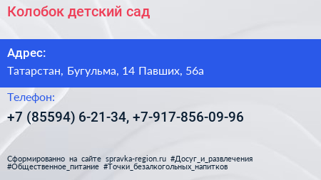 Колобок, детский сад по адресу Татарстан, Бугульма, 14 Павших, 56а в дальнейшем Организация, размещена в следующих категориях: