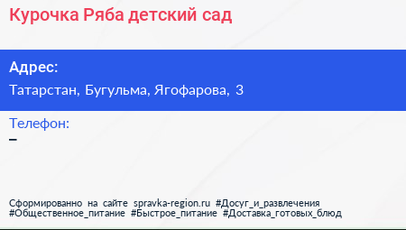 Курочка Ряба, детский сад по адресу Татарстан, Бугульма, Ягофарова, 3 в дальнейшем Организация, размещена в следующих категориях: