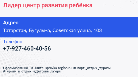 Лидер, центр развития ребёнка по адресу Татарстан, Бугульма, Советская улица, 103 в дальнейшем Организация, размещена в следующих категориях: