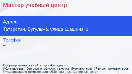 Мастер, учебный центр по адресу Татарстан, Бугульма, улица Шашина, 1 в дальнейшем Организация, размещена в следующих категориях:
