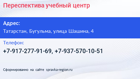 Переспектива, учебный центр по адресу Татарстан, Бугульма, улица Шашина, 4 в дальнейшем Организация, размещена в следующих категориях: