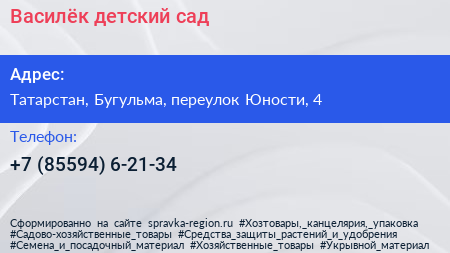Василёк, детский сад по адресу Татарстан, Бугульма, переулок Юности, 4 в дальнейшем Организация, размещена в следующих категориях: