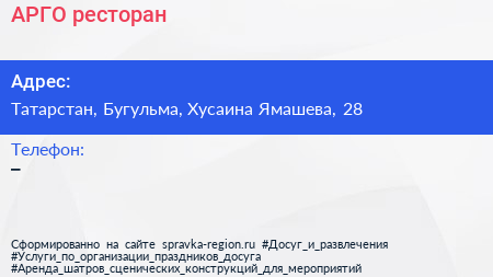 АРГО, ресторан по адресу Татарстан, Бугульма, Хусаина Ямашева, 28 в дальнейшем Организация, размещена в следующих категориях: