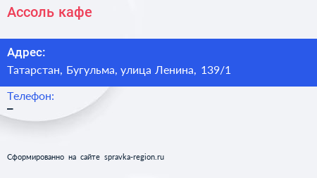 Ассоль, кафе по адресу Татарстан, Бугульма, улица Ленина, 139/1 в дальнейшем Организация, размещена в следующих категориях: