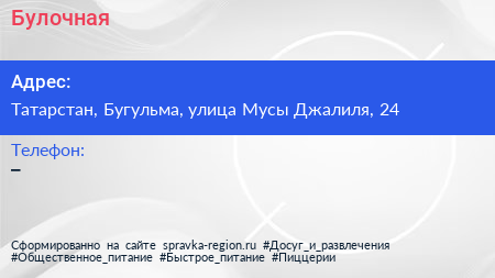 Булочная по адресу Татарстан, Бугульма, улица Мусы Джалиля, 24 в дальнейшем Организация, размещена в следующих категориях: