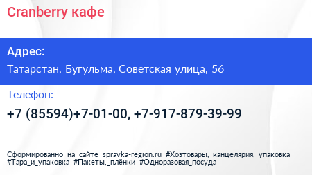 Cranberry, кафе по адресу Татарстан, Бугульма, Советская улица, 56 в дальнейшем Организация, размещена в следующих категориях: