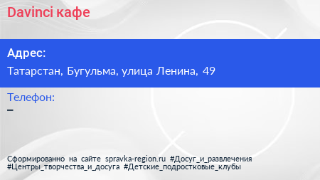 Davinci, кафе по адресу Татарстан, Бугульма, улица Ленина, 49 в дальнейшем Организация, размещена в следующих категориях: