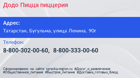 Додо Пицца, пиццерия по адресу Татарстан, Бугульма, улица Ленина, 90г в дальнейшем Организация, размещена в следующих категориях: