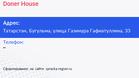 Doner House по адресу Татарстан, Бугульма, улица Газинура Гафиатуллина, 33 в дальнейшем Организация, размещена в следующих категориях:
