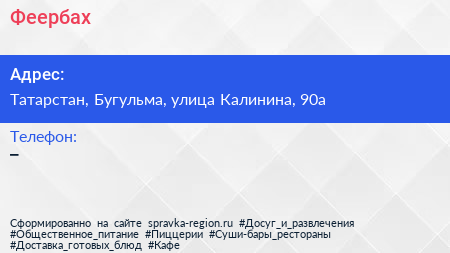 Феербах по адресу Татарстан, Бугульма, улица Калинина, 90а в дальнейшем Организация, размещена в следующих категориях:
