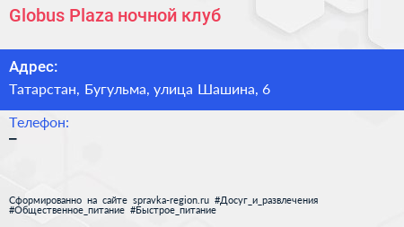Globus Plaza, ночной клуб по адресу Татарстан, Бугульма, улица Шашина, 6 в дальнейшем Организация, размещена в следующих категориях: