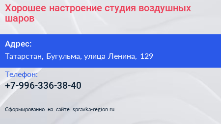Хорошее настроение, студия воздушных шаров по адресу Татарстан, Бугульма, улица Ленина, 129 в дальнейшем Организация, размещена в следующих категориях: