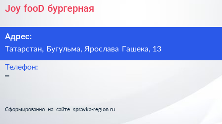 Joy&fooD, бургерная по адресу Татарстан, Бугульма, Ярослава Гашека, 13 в дальнейшем Организация, размещена в следующих категориях: