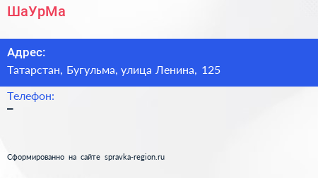 ШаУрМа по адресу Татарстан, Бугульма, улица Ленина, 125 в дальнейшем Организация, размещена в следующих категориях: