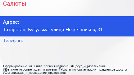 Салюты по адресу Татарстан, Бугульма, улица Нефтянников, 31 в дальнейшем Организация, размещена в следующих категориях: