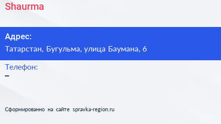 Shaurma по адресу Татарстан, Бугульма, улица Баумана, 6 в дальнейшем Организация, размещена в следующих категориях:
