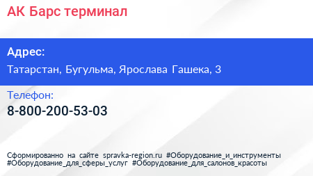 АК Барс, терминал по адресу Татарстан, Бугульма, Ярослава Гашека, 3 в дальнейшем Организация, размещена в следующих категориях: