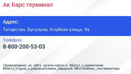 Ак Барс, терминал по адресу Татарстан, Бугульма, Клубная улица, 9а в дальнейшем Организация, размещена в следующих категориях: