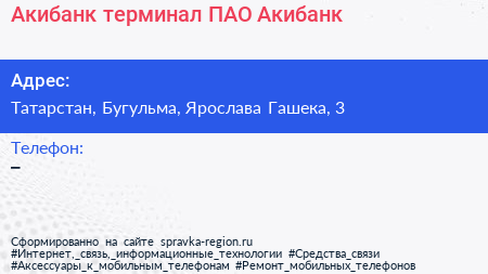 Акибанк, терминал, ПАО Акибанк по адресу Татарстан, Бугульма, Ярослава Гашека, 3 в дальнейшем Организация, размещена в следующих категориях: