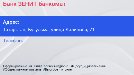 Банк ЗЕНИТ, банкомат по адресу Татарстан, Бугульма, улица Калинина, 71 в дальнейшем Организация, размещена в следующих категориях:
