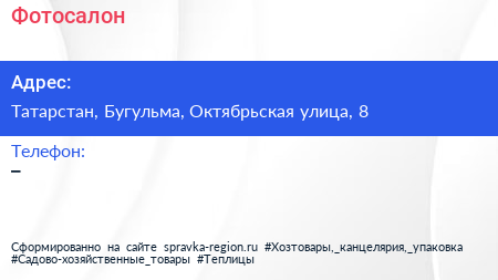 Фотосалон по адресу Татарстан, Бугульма, Октябрьская улица, 8 в дальнейшем Организация, размещена в следующих категориях:
