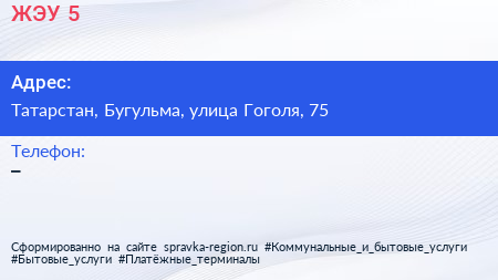 ЖЭУ №5 по адресу Татарстан, Бугульма, улица Гоголя, 75 в дальнейшем Организация, размещена в следующих категориях: